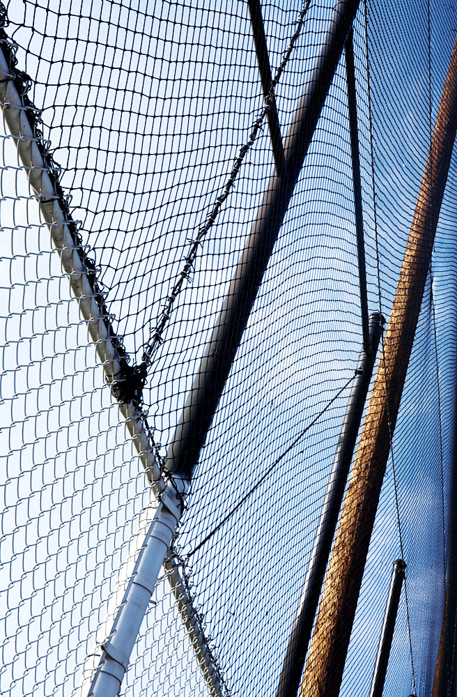Double height fencing where the school property meets the sidewalk of the bordering street restricts access to the Jordan High School athletic fields. Shot standing right next to the fence, with the camera tilted at an extreme angle.