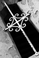 Window Cross II - b/w Date: 03/16/2011 Decorative wrought iron adorning a window in the side wall of a semi-enclosed patio area at the front of this building. It's fun to play with the geometry of the frame by shooting up and across at an angle like this.