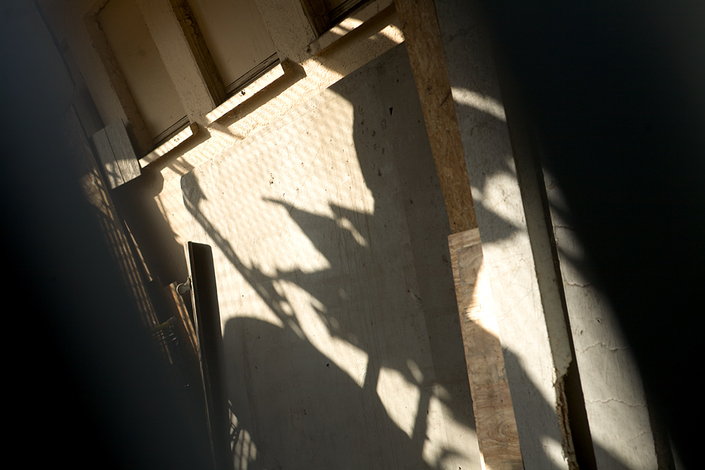 Distorted Jungle Date: 03/16/2011 This was the first set of windows where the distorted reflections of trees caught my attention. The windows of the old buildings are not in very good shape - some of the panels are cracked, dirty, fogged, and boarded over. The tree reflections range from ghostly to almost mirror sharp in the various panels, and create a sense of dislocation where it almost appears you're either looking in through a window or out through a window, rather than viewing reflections.