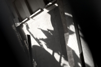 Eagle Flight - b/w Date: 03/16/2011 'Shapes in the clouds' bring to my mind in eagle in flight when I look at this shadow. This is shot with my lens right up against the narrow space between two vertical slats in the fencing enclosing this storage area.