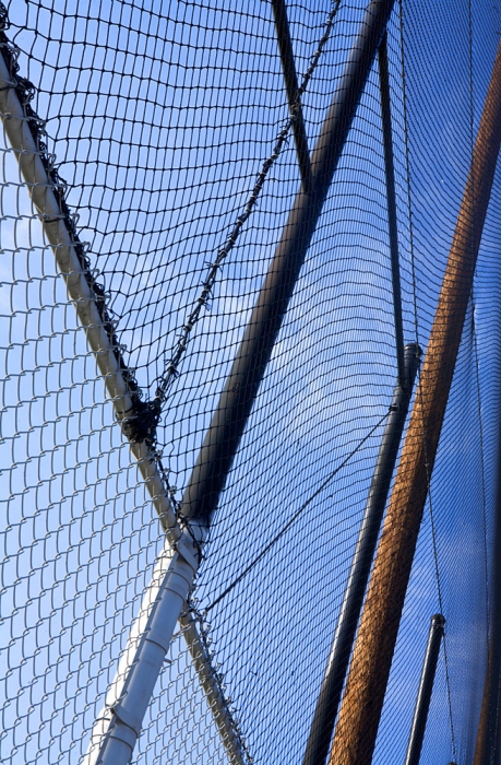 Fencing Blue Skies - alternate color process Date: 03/16/2011 Double height fencing where the school property meets the sidewalk of the bordering street restricts access to the Jordan High School athletic fields. Shot standing right next to the fence, with the camera tilted at an extreme angle. A brighter and less saturated version of the image.