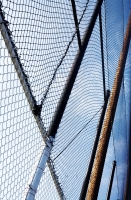 Double height fencing where the school property meets the sidewalk of the bordering street restricts access to the Jordan High School athletic fields. Shot standing right next to the fence, with the camera tilted at an extreme angle. A brighter and less saturated version of the image.