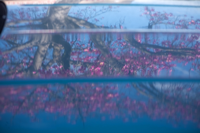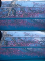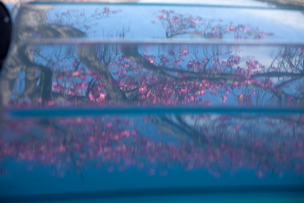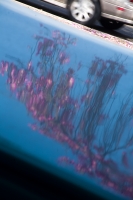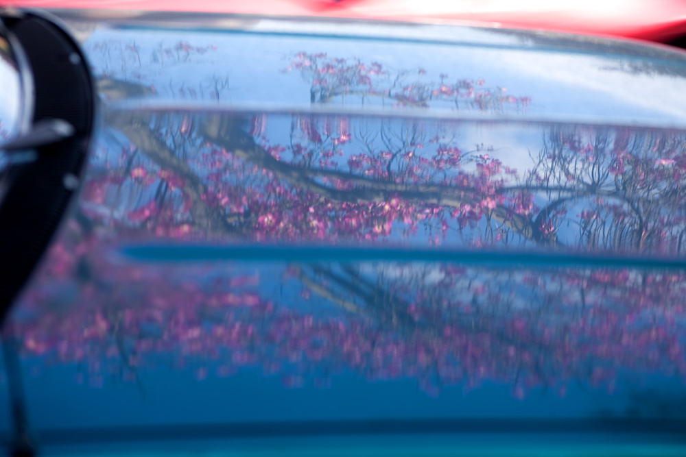 Two consecutive frames. Tiny steps in any direction really changed how the reflected branches were positioned and curved across the vehicle.