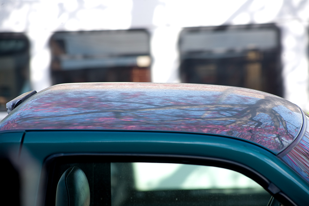 Reflections in the roof of the truck cab. As I was taking a series of shots, I liked the contrasts provided when another vehicle was passing by rather than the top part of the frame being filled by the buildings across the street. So for this shot, I saw an approaching bus, and timed my shutter click accordingly.