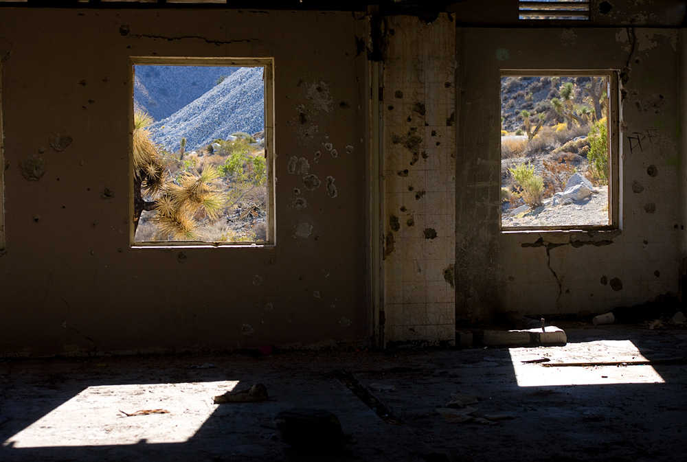 There was something surreal about the desert view out the windows of this half-fallen abandoned house.