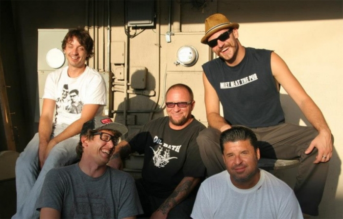Before moving into the more formal indoor studio shooting, the band handed me a camera belonging to one of the members, and asked me to take a few shots of them outside on the backlot. We shot a set of really funny antics, and then a set with the band posing at the picnic table. This particular shot is the one published with the Examiner.com pre-release review of the record.