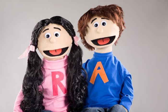 Studio photo of handmade puppet characters "Rosie" and "Andy," eventually used in CD art and web logo layouts.