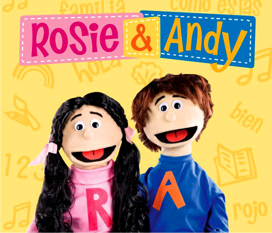 Studio photo of handmade puppet characters "Rosie" and "Andy," eventually used in CD art and web logo layouts.
