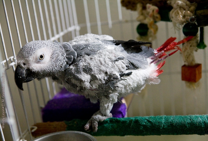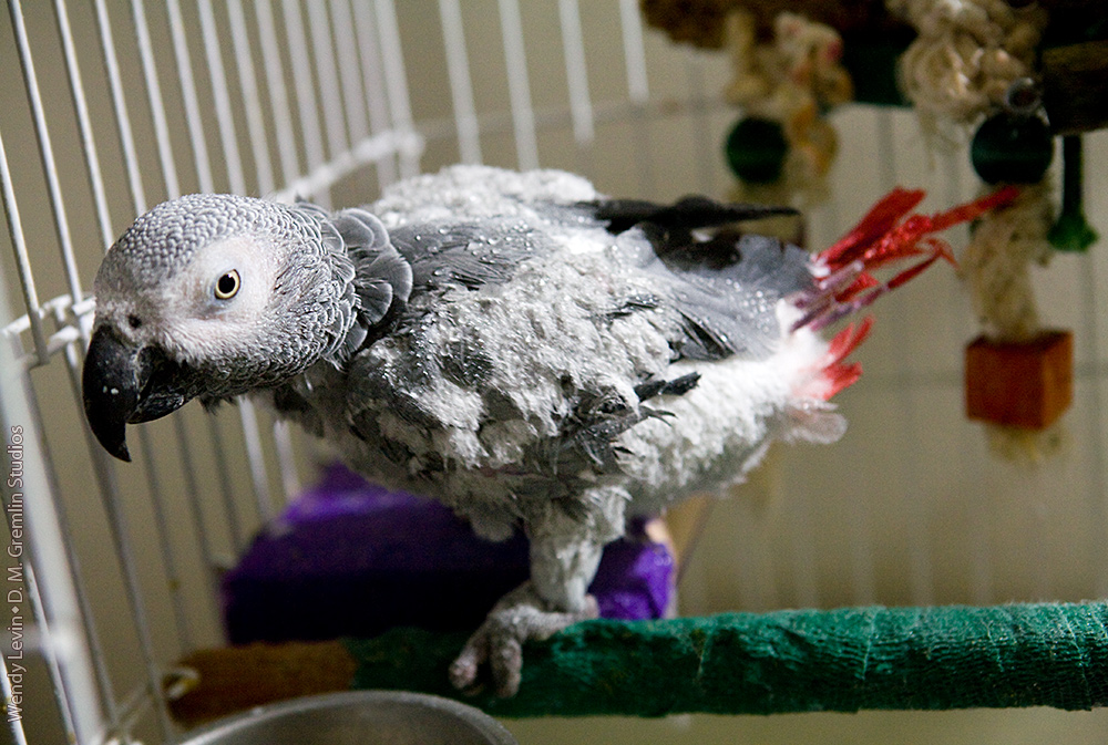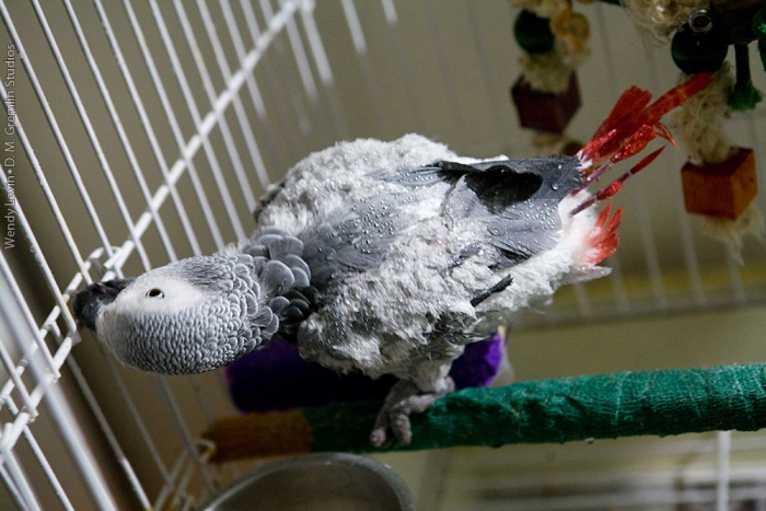 Friday enjoyed some quality time chewing on the food-dish door of her cage after her bath. The progress of her feather growth, especially her tail and wing feathers, shows really well here.