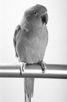I was experimenting with color temperature settings. This image was shot at a much lower color temperature than the other photos of Gordie in this album. Hence the much bluer tone to her feathers and the silver stand she's perched on.