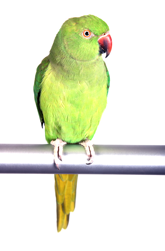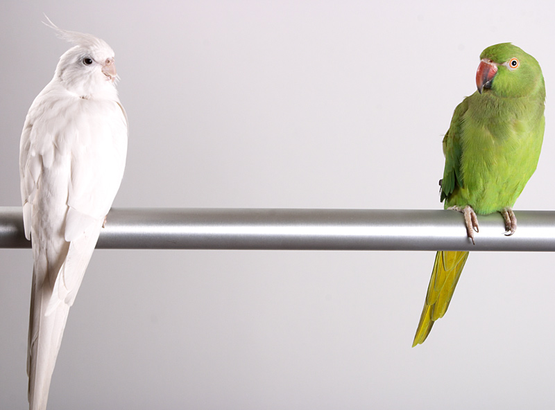 Casper the albino cockatiel and Gordie the green Indian Ringneck.