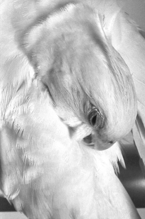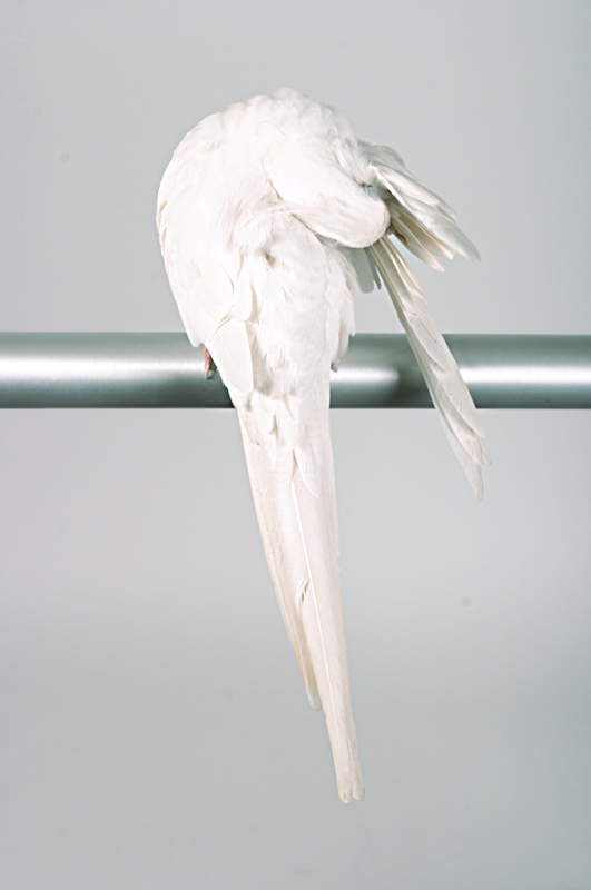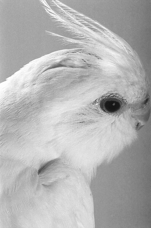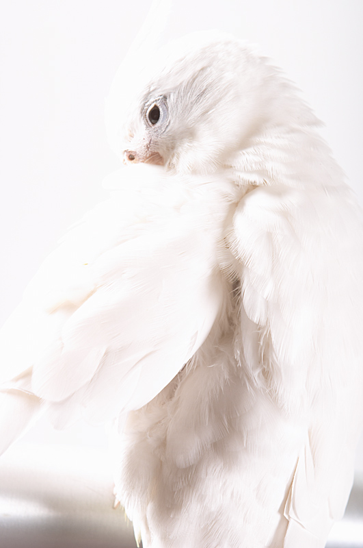 This would be her beauty shot, I suppose. It was actually quite interesting experimenting with lighting and exposure of a white bird on a white backdrop. A surprising variety of effects can be achieved.