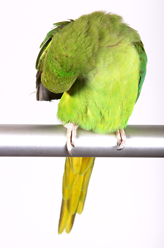 I was experimenting with color temperature settings. This image was shot at a much lower color temperature than the other photos of Gordie in this album. Hence the much bluer tone to her feathers and the silver stand she's perched on.