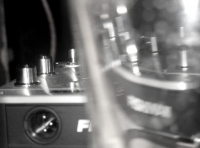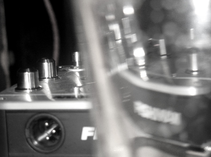 Watching a couple of my musician friends play at one of their gigs, and got this shot of Chris's guitar preamp, through the distorting curvature of a beer glass.