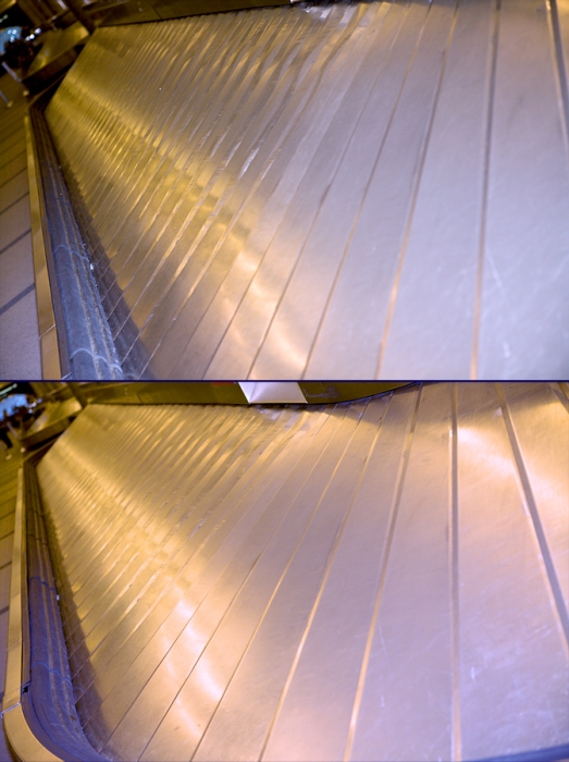 I was going back and forth between shooting with and without my on-camera flash, and had more flash power than I expected when I took this shot of three shiny drinking fountains mounted on a metal wall outside a restroom.
