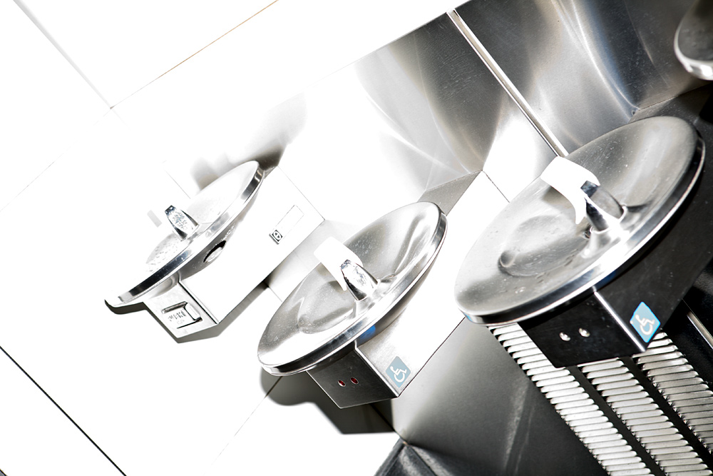 I was going back and forth between shooting with and without my on-camera flash, and had more flash power than I expected when I took this shot of three shiny drinking fountains mounted on a metal wall outside a restroom.