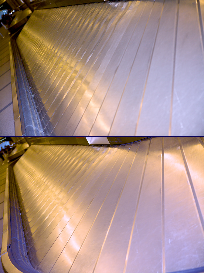 This is pure abstraction, for the interest in the shapeless colors reflected into the curved surface of the metal, shot from up close to remove all sense of context.