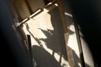 'Shapes in the clouds' bring to my mind in eagle in flight when I look at this shadow. This is shot with my lens right up against the narrow space between two vertical slats in the fencing enclosing this storage area.