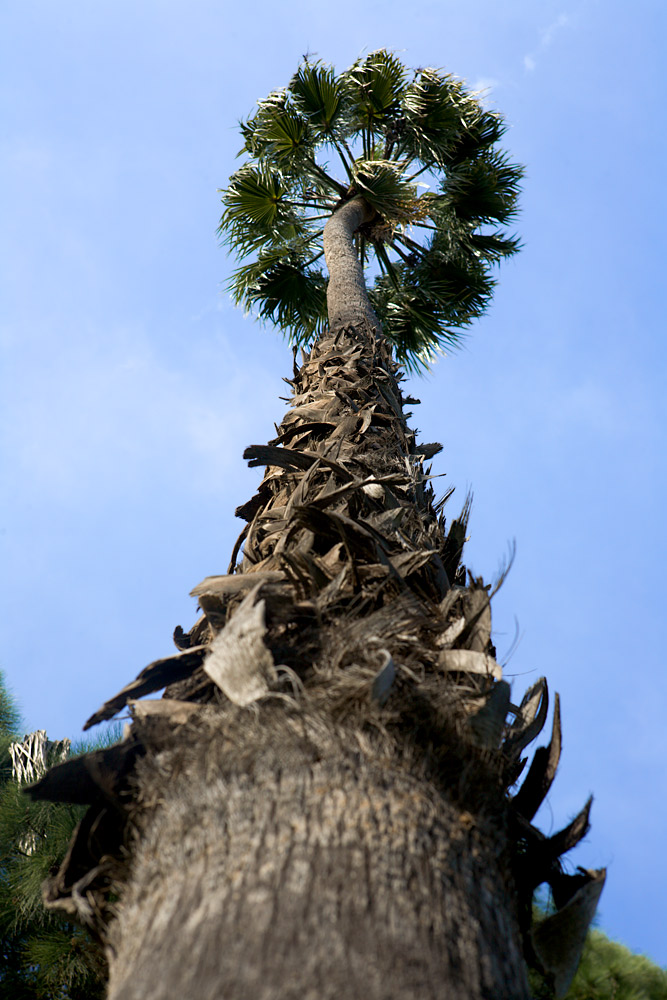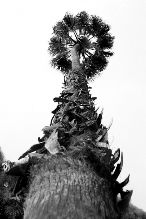 An ordinary palm tree, shot from almost right next to it, looking upward. The black and white really brings out the texture in all those bark layers.