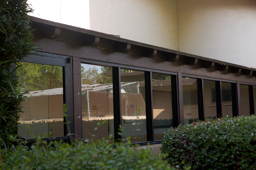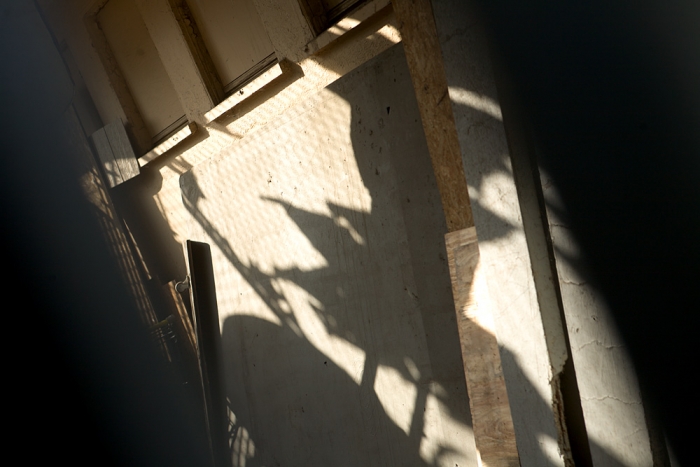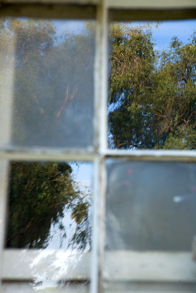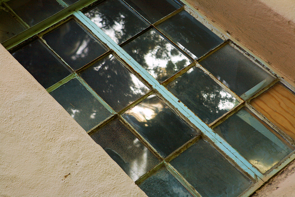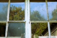 This was the first set of windows where the distorted reflections of trees caught my attention. The windows of the old buildings are not in very good shape - some of the panels are cracked, dirty, fogged, and boarded over. The tree reflections range from ghostly to almost mirror sharp in the various panels, and create a sense of dislocation where it almost appears you're either looking in through a window or out through a window, rather than viewing reflections.
