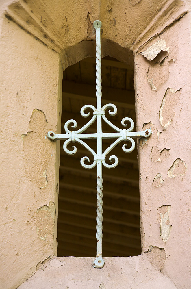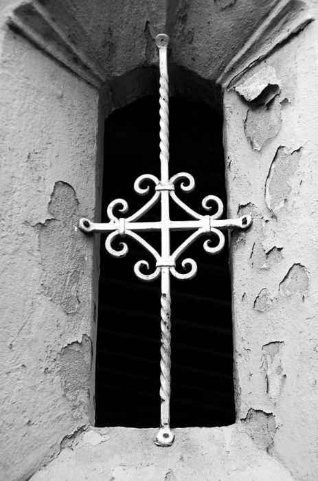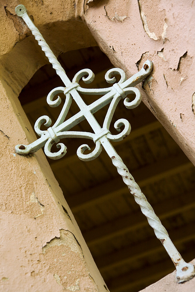 Decorative wrought iron adorning a window in the side wall of a semi-enclosed patio area at the front of this building. It's fun to play with the geometry of the frame by shooting up and across at an angle like this.