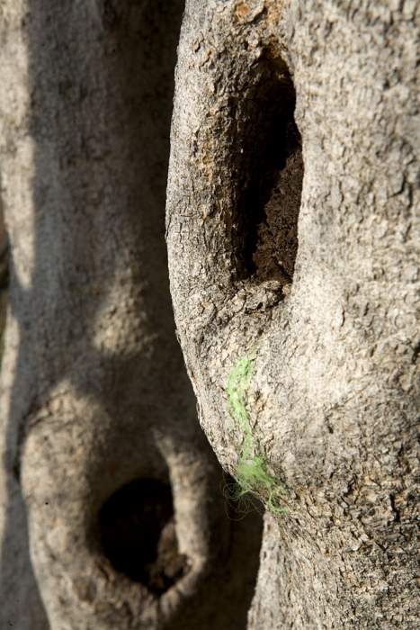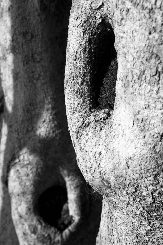Knots in two adjoining trunks of a tree, forming an oblique figure eight in the flattened perspective of a photo frame. In black and white, the bark textures are accentuated, and so are the light and dark, round and rectangular shapes that divide the frame into unequal quadrants.