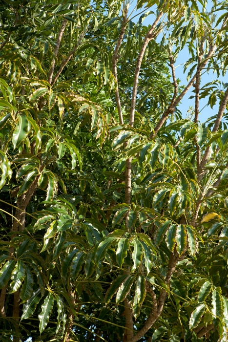 An ordinary palm tree, shot from almost right next to it, looking upward.