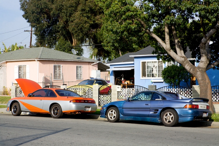 Houses line the street that runs right behind the park and neighboring high school. Not visible from this angle, a young man was working under the open hood of the orange car, while his black and orange cat sat on the lawn a few feet away.