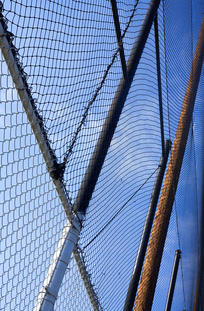 Double height fencing where the school property meets the sidewalk of the bordering street restricts access to the Jordan High School athletic fields. Shot standing right next to the fence, with the camera tilted at an extreme angle. A brighter and less saturated version of the image.