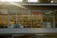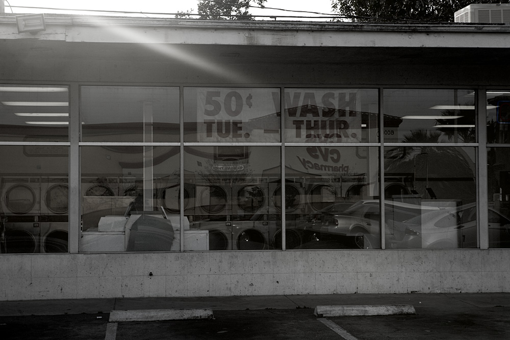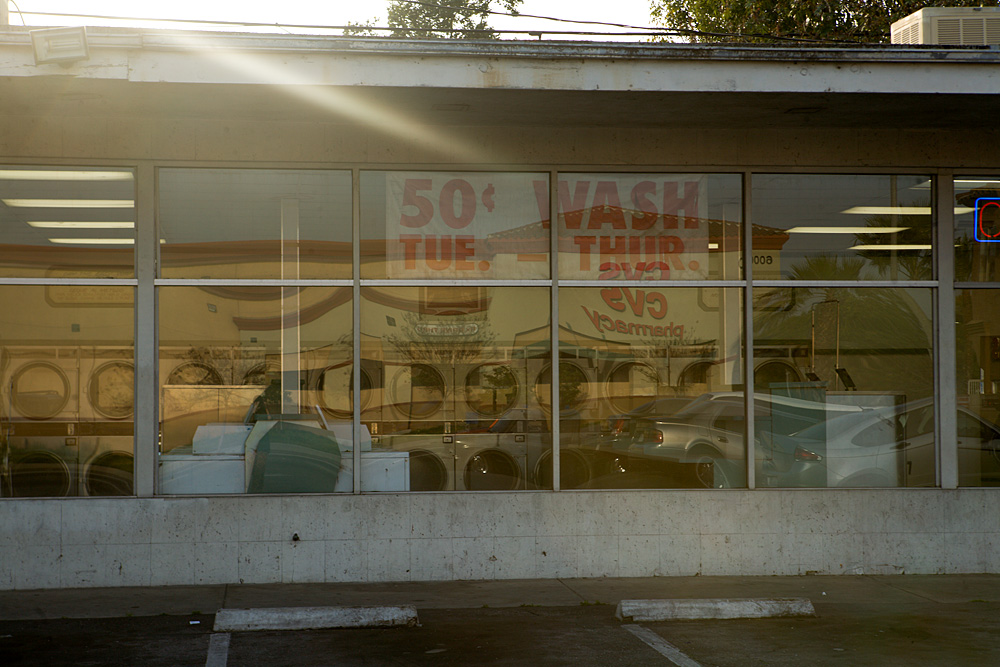 The CVS building and sign across the street are reflected in the glass front of the laundromat half a block down from the studio. The sun was low in the sky a little before dusk here, creating the big slash of flare at upper left.