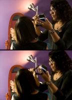 A really nice pair of candid shots during the hair and makeup styling switch focus between model and MUA in the foreground, and model's face in the mirror in background.