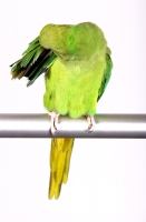 Casper and Gordie Date: 06/03/2008 Casper the albino cockatiel and Gordie the green Indian Ringneck.