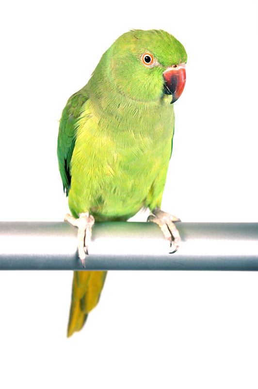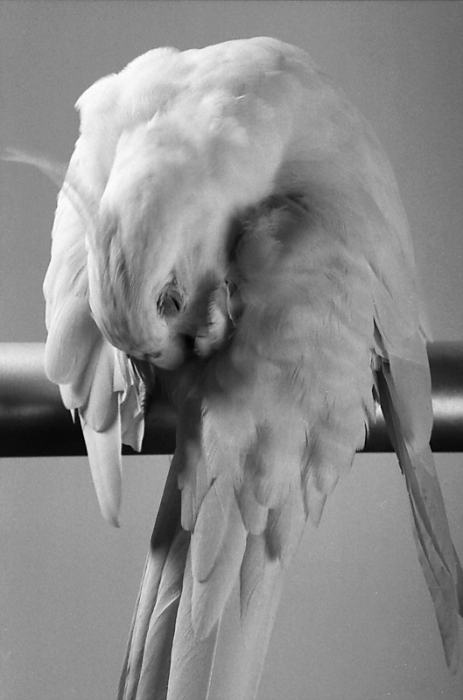 I was experimenting with color temperature settings. This image was shot at a much lower color temperature than the other photos of Gordie in this album. Hence the much bluer tone to her feathers and the silver stand she's perched on.